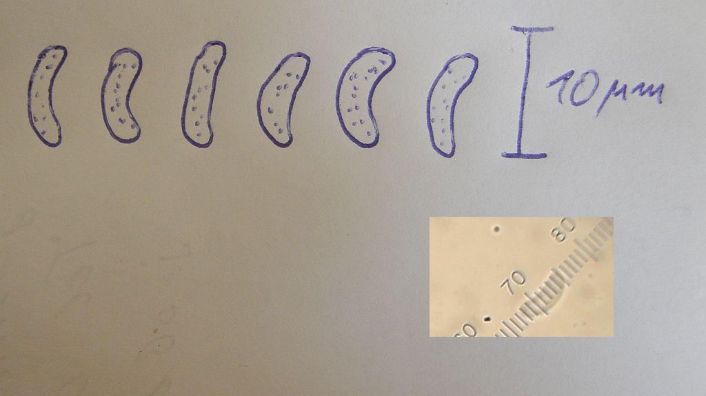 Die Sporen messen ~7-9,5 µm und sind zumeist allantoid gebogen. Das allerdings ist in der Zeichnung unten etwas zu überzeichnet, ein wenig schwächer ist die Krümmung eigentlich.