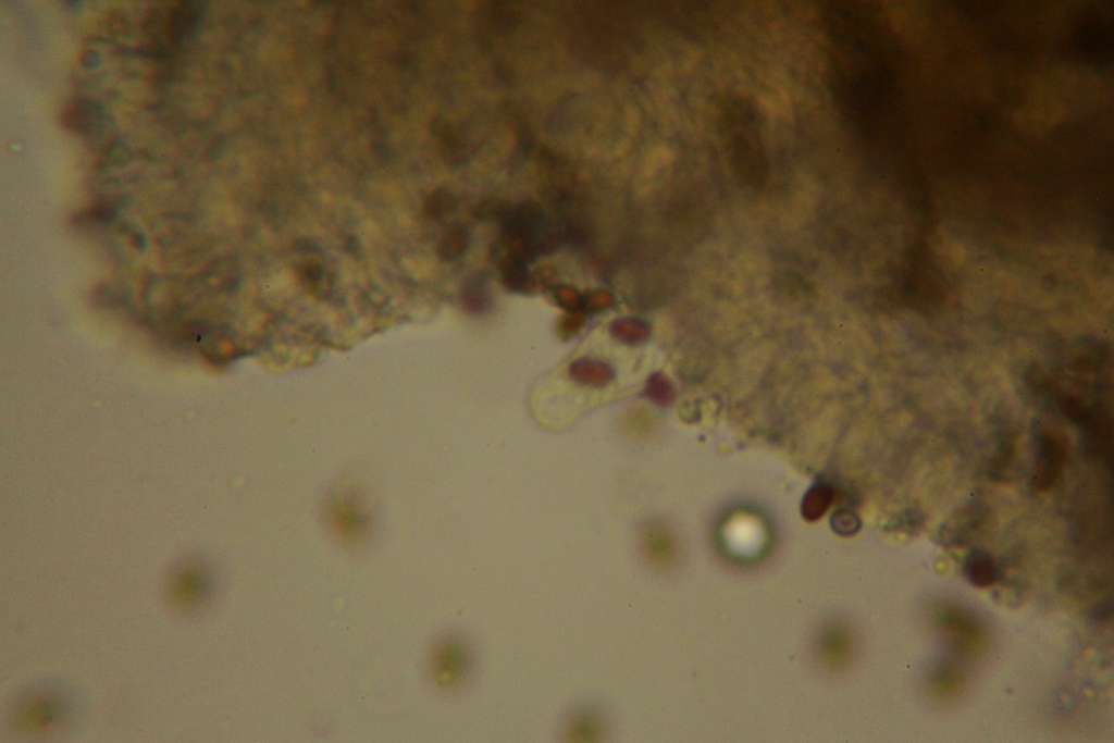 Cheilo- und Pleurozystiden ähneln sich hier zwar in der Form, aber die Cheilos sind viel, viel kleiner und zudem oft so selten, dass man sich schimmelig sucht. Allerdings ist die Lamellenschneide eng besetzt mit ballonförmigen Zellen, mit ein paar eingestreuten "echten" Cheilos. Tipp: Gucken, ob man wirklich ein Stück Schneide unterm Mikro hat. Oft erkennbar, weil die heller ist als der Rest der Lamelle.