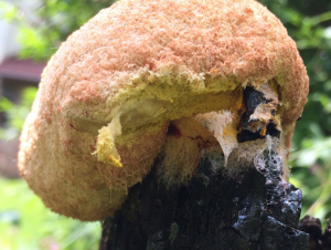 Ich halte das für den "Fruchtkörper" eines Schleimpilzes, dazu passt ja auch das Setting (erhöht auf einem Baumstumpf), vermutlich von Fuligo septica oder einer ähnlichen Art.
