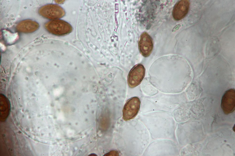 wahrscheinlich ist das Coprinopsis laanii. Die Risse in den Sporen sind keine, nur Falten in einem Perispor (Außenhülle). Die Noppen auf den runden Velumzellen sind typisch für die Gruppe.