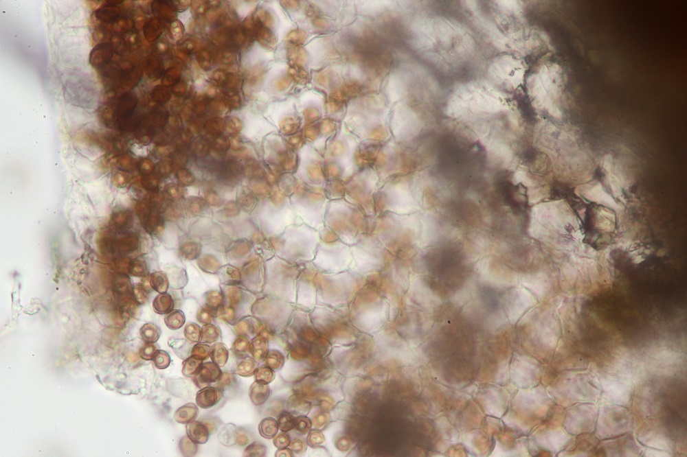 Du schreibst, es handelt sich um einen Basidio. Bei so vielen Sporen muss ja auch irgendwo die Fruchtschicht sein mit vielen reifen Basidien. Zeig die am besten erst mal.