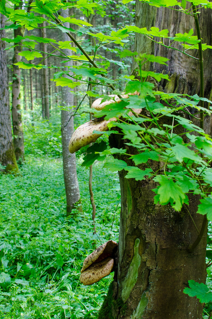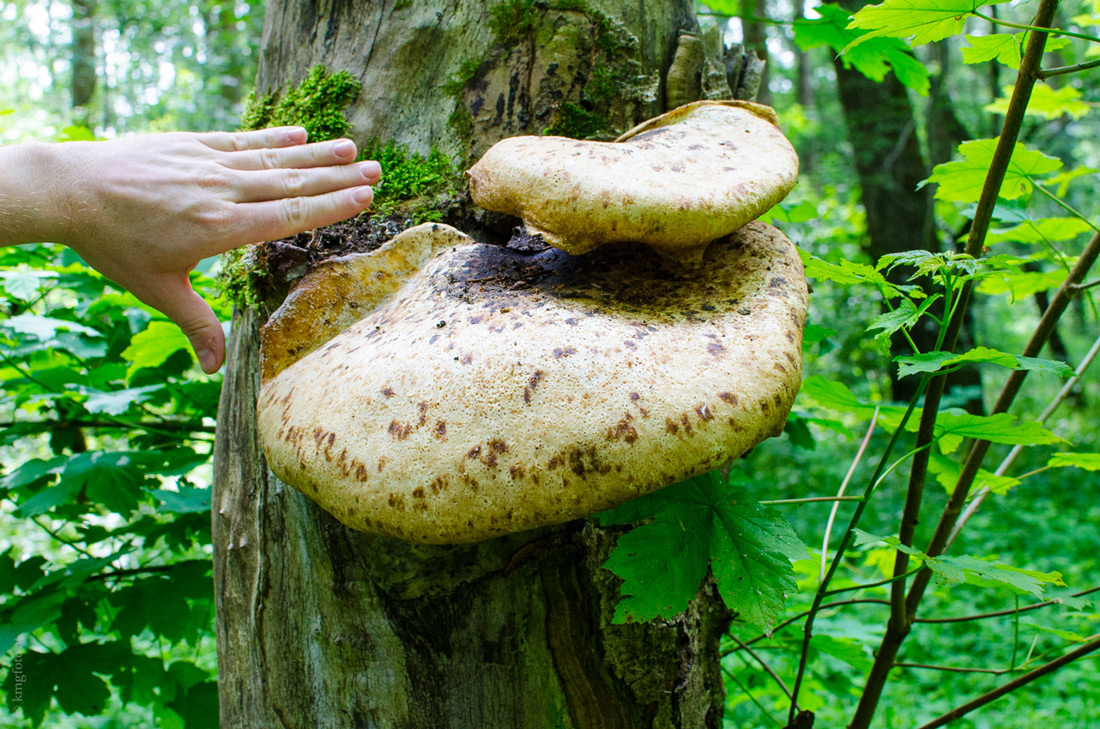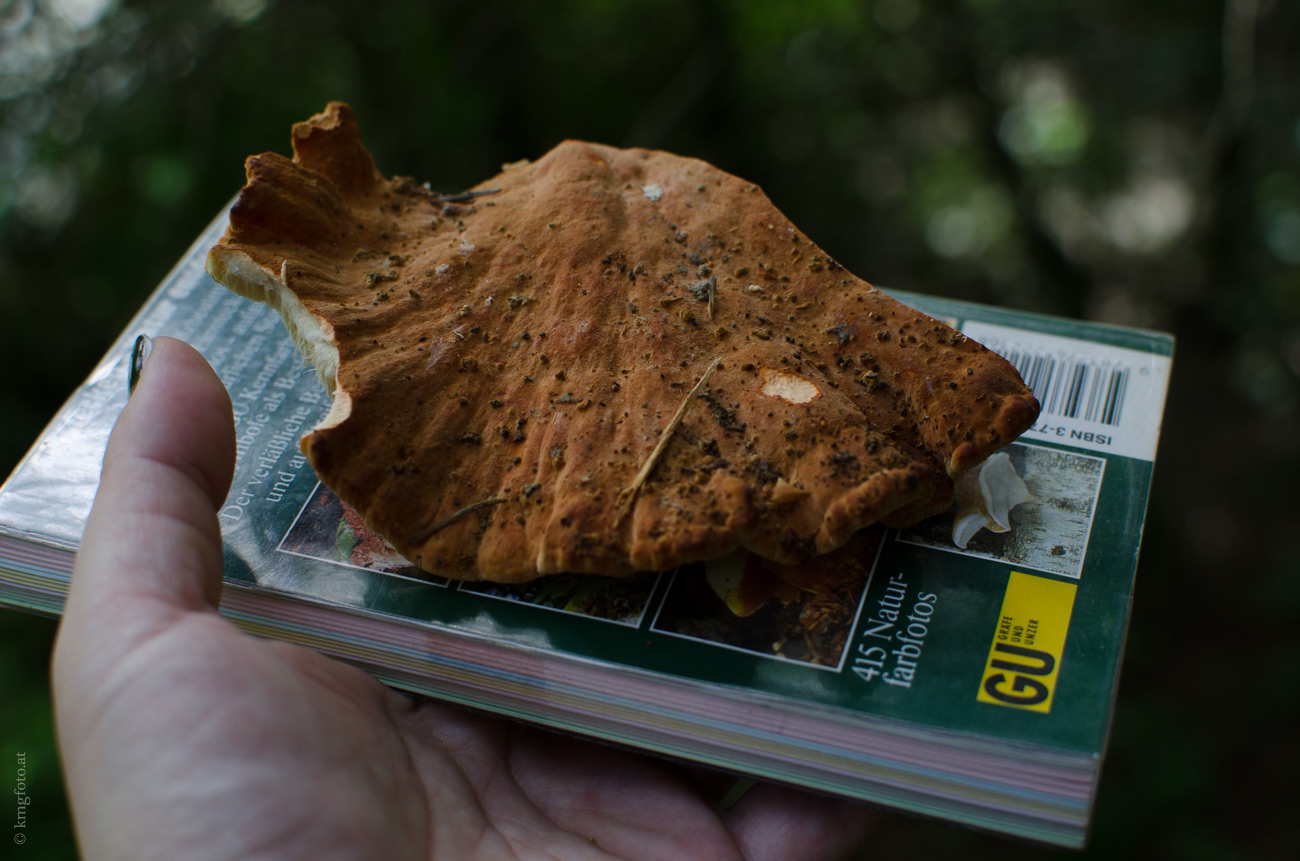 8. Der älteste Pilz, den ich je gefunden habe. Und der größte Baumpilz. Schuppiger Porling Polyporus squamosus Der Stiel, die herablaufenden Poren, die Größe und die Schuppen waren hier für mich ausschlaggebend.