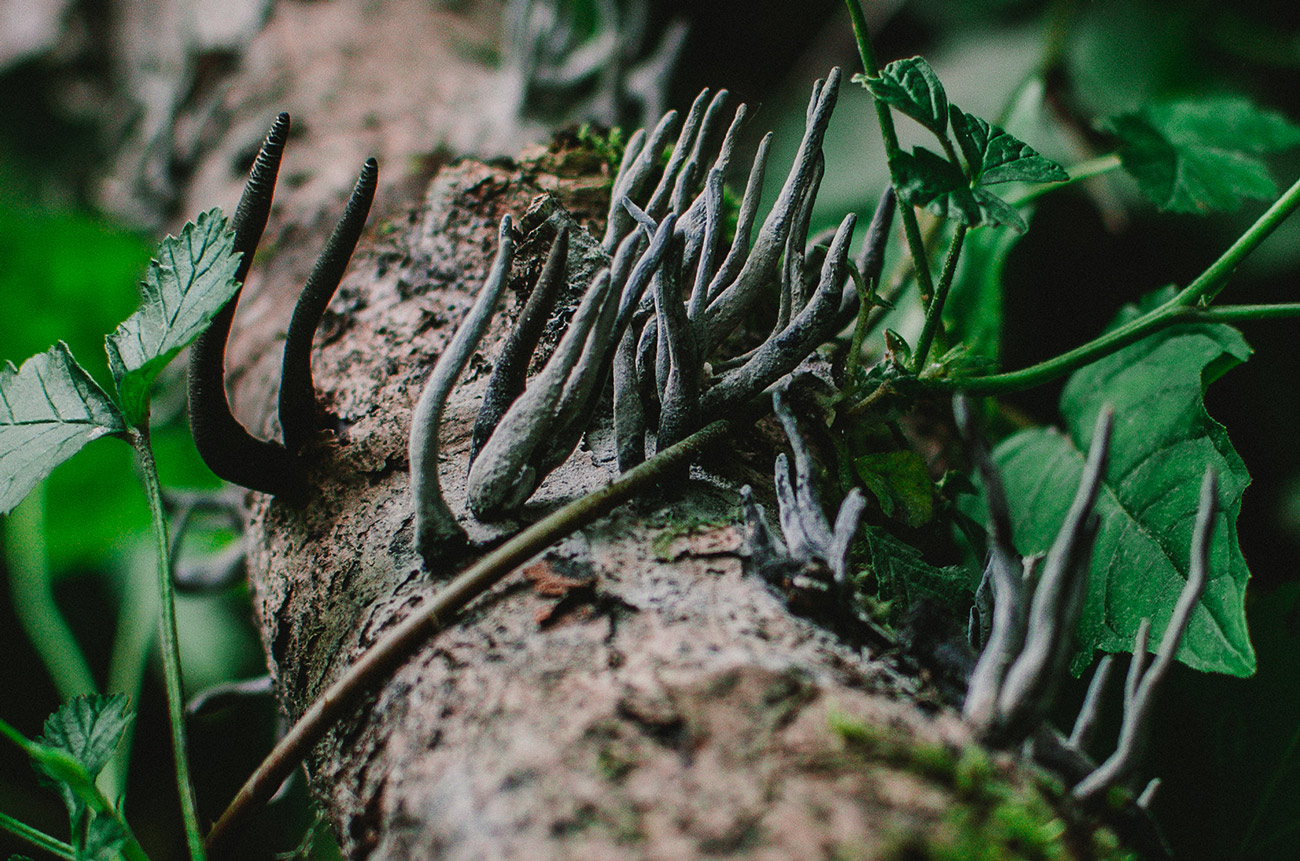 9. Eine Holzkeule Xylaria spec. evtl. filiformis longipes Ein Schuss ins Blaue auf einem Laubbaumast, Durchmesser ca. 15cm. Höhe der Keulen ca. 5cm.