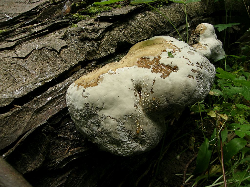 Die Fehler sind oben schon ausgestrichen: Der Flache Lackporling ist keiner, sondern das ist ein Wulstiger (Ganoderma australe). Was mich ziemlich überrascht hat, Wuchsform, Dicke der Hutkruste und weiße Einlagerungen im Kontext hätten besser zu G. applanatum gepasst.