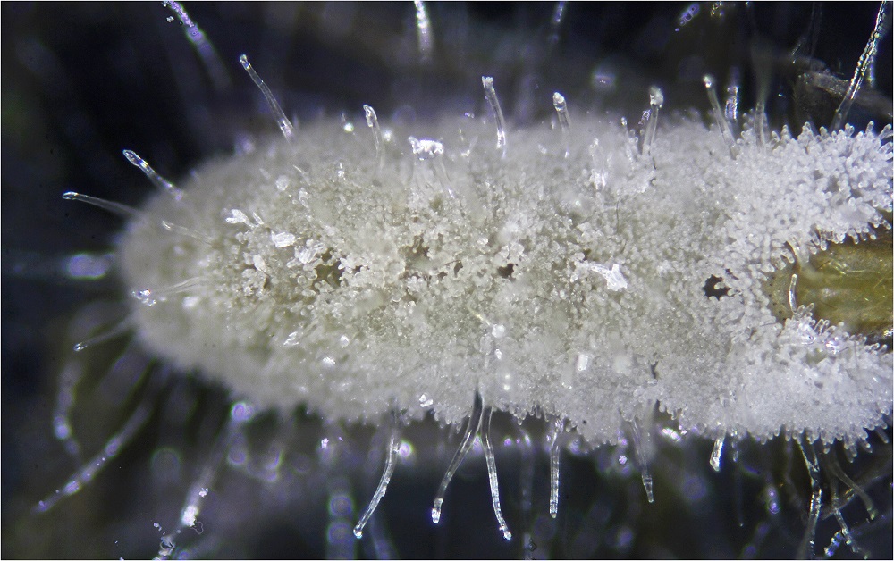 Um das Insekt herum ist eine Weiße Puderartige Schicht und das sind die Sporen.