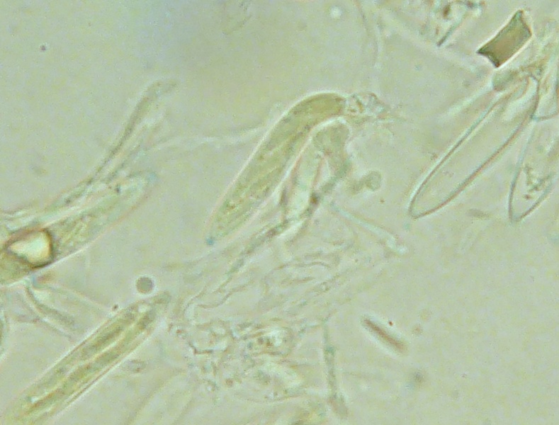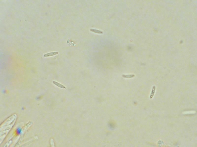 • Auf der Distel zeigt sich ein weiteres Becherchen. Wahrhaft winzig, von beige-bräunlicher Farbe. Die Sporen messen 5,5-6,3 x 1,2-1,6 µm und zeigen an jedem Pol ein Tröpfchen. Mit Melzer färbt sich der Ascusporus blau. Die Asci haben m.M.nach keine Haken, aber was weiß ich schon von Haken. :)