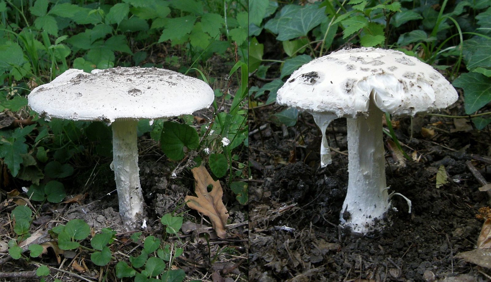 Der Kegelhütige Knollenblätterpilz (Amanita virosa) hat meist keine oder kaum Velumreste am Hut, seine Stielbasis steckt in einer häutigen Scheide.