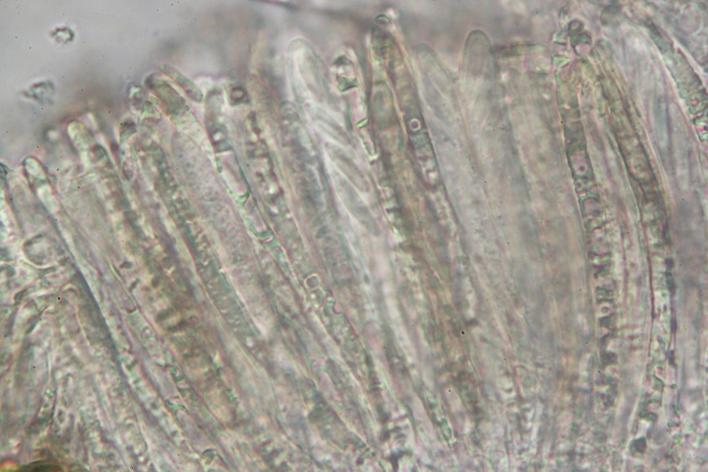 Meine verdächtigte Kandidatin Mollisia benesuada (Hellrandiges Weichbecherchen) fällt dadurch auf, dass sie neben einer meist sehr hellen Apothezienfarbe und unkugeligen Ectal-Excipulumzellen, siehe dein Bild 6 (deshalb ist wohl der offizielle Name immer noch Pyrenopeziza benesuada) regelmäßig Sporenbreiten hat, die an die 3 µm kratzt bzw. auch übersteigt (neben Sporeninhalt, KOH-Reaktion etc.).