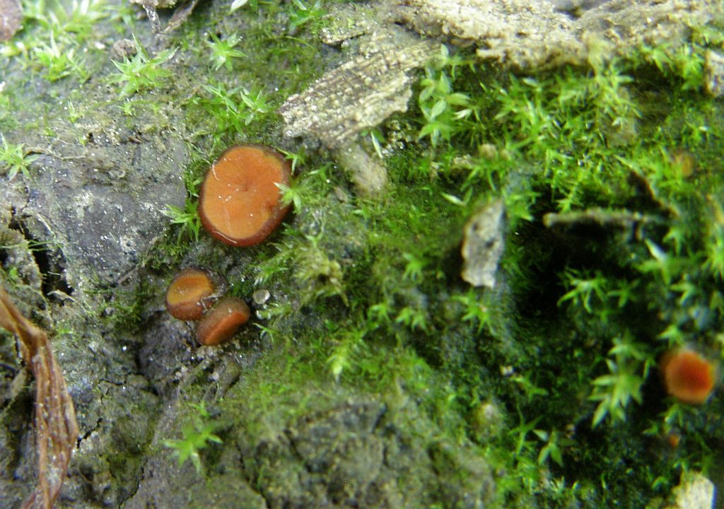 Folgende Pilzche fand sich am Sonntag im Odenwald, in einem feuchten Talgrund, wo vom Wanderweg ein verlassener Forstweg abzweigt. Die Fruchtkörper wachsen gedrängt auf dem lehmigen Erdboden, wo sich die Fahrspuren langsam mit Moos und Gräsern bedecken.