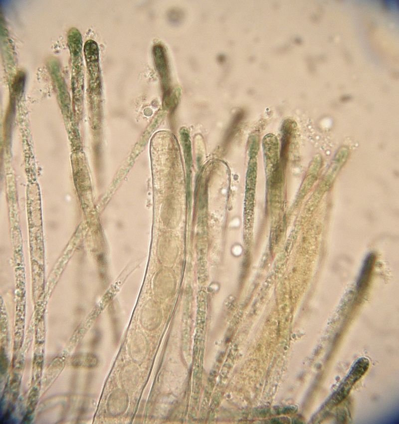 Die Paraphysen sind keulig, das Pigment darin granuliert, verfärbt mit Lugol (wie wohl die meisten karotine) grün, die Asci sind apikal IKI-: