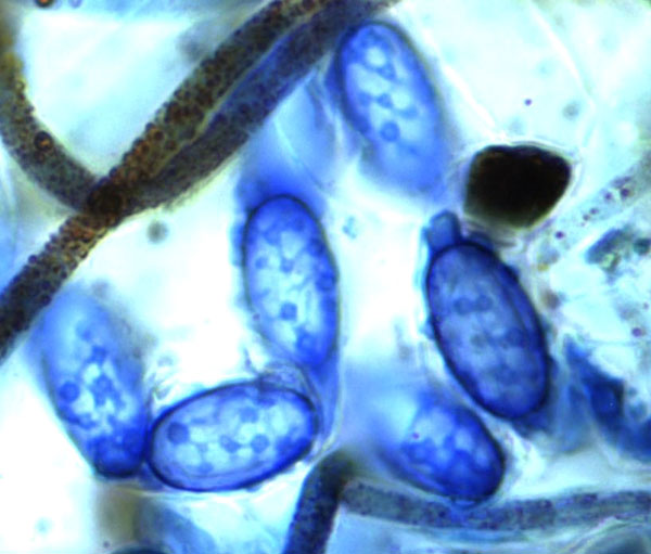 Die Haare sind abgerundet, eher dünnwandig, septiert und kräftig braun pigmentiert: