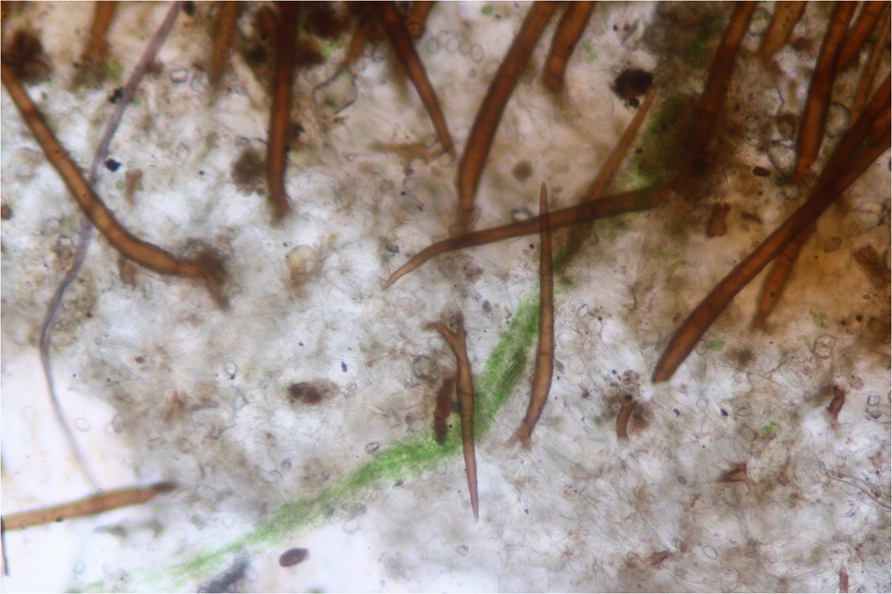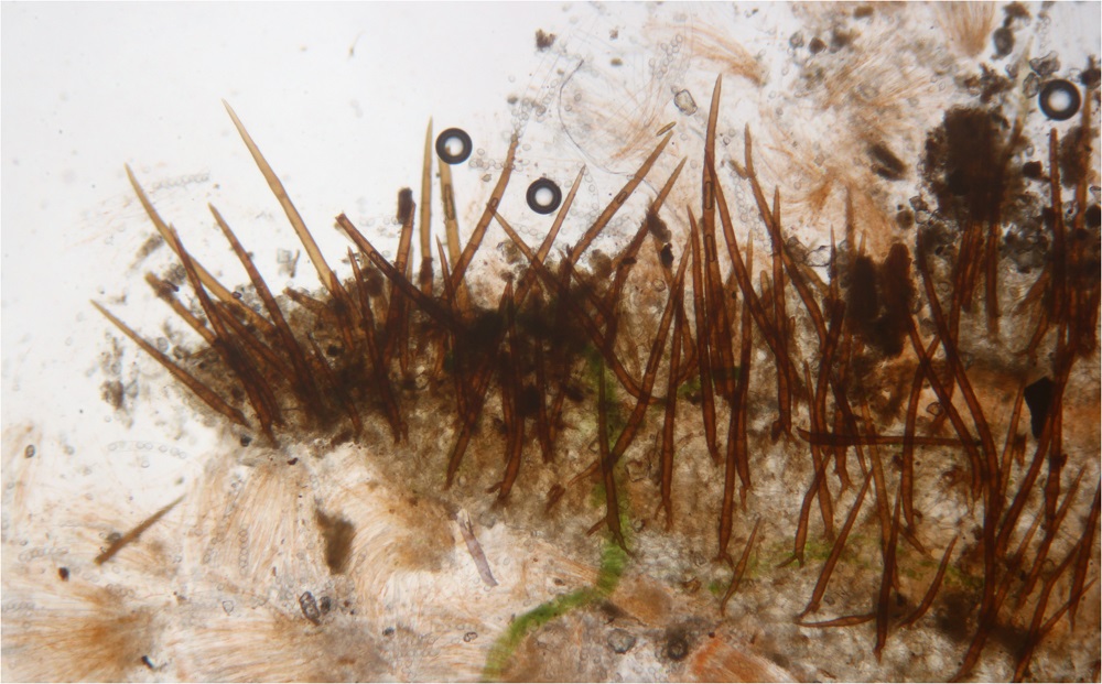 Oben links am Fruchtkörper die Büschelweise Haare.