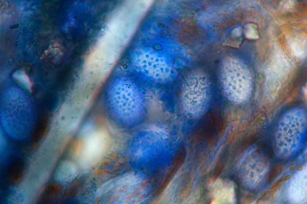 Im Baumwollblau sieht man das Ornament noch deutlicher, wo die "Kugeln" am Ornament bis 1 µm Durchmesser hatten.