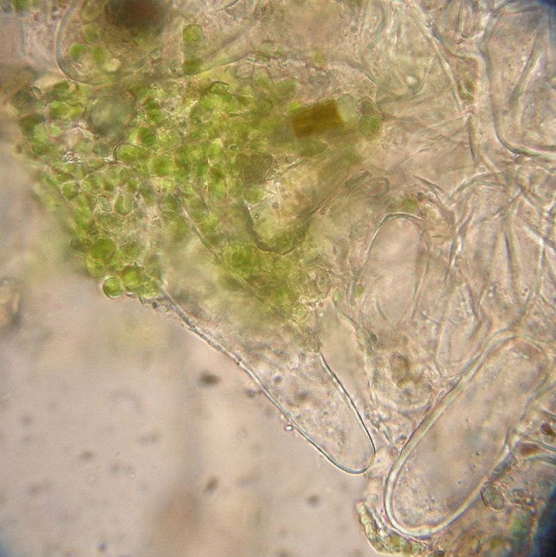 Was noch auffällig ist: An der Apobasis sind die großen, golbosen Zellen und die Haare teils stark verkrustet (was einfach Dreck sein kann), aber da sind noch zylindrische Algen (vermute ich jedenfalls), die in den Becher hineinwachsen.