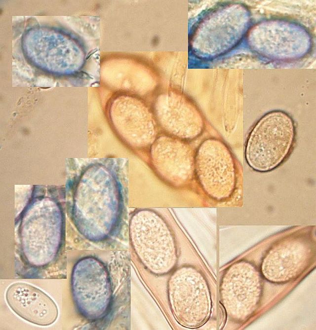 Die Apothecien sind allesamt im Wachstum gestört. Es finden sich Asci mit stark unterschiedlich großen Sporen in einem Ascus. Auch solche, in dem nur ein Teil scheinbar gut ausgebildet ist und der Rest verkrüppelt. Ein Ascus enthielt sogar 10 Sporen, zwei davon jedoch verkrüppelt. Die Ornamentation der Sporen ist ebenfalls sehr unterschiedlich und zudem undeutlich. Ich habe nach erhitzen in BWB auch Sporen gesehen, bei denen sich das Exospor abgelöst hat. Aber auch das ist bei so gestörten Proben kein sicheres Merkmal.