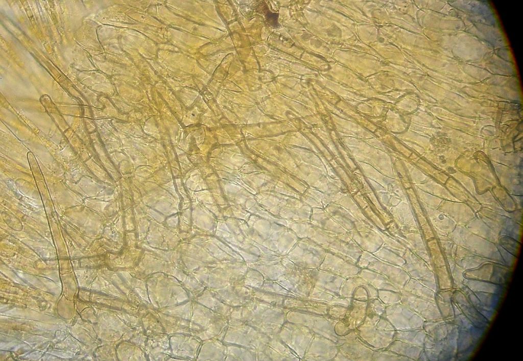 Darauf finden sich zwei Typen von Haaren: Einmal hyaline, dünnwandige Elemente und dazu schwach bräunlich pigmentierte, etwas dickwandige "echte" Haare.