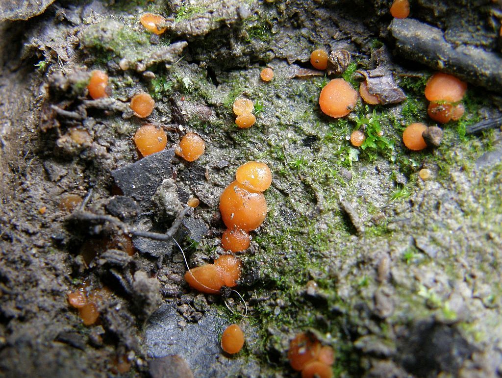 Weiter unten, am Grund der Reifenspur befanden sich weitere Kollektionen orangener Becherchen, die ich ebenfalls der geschädigten Scutellinia zugeordnet hätte. Oder es wäre Scutellinia crucipila gewesen.