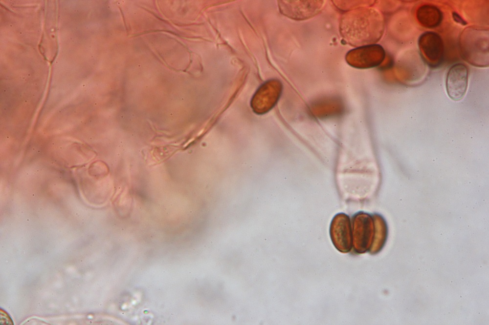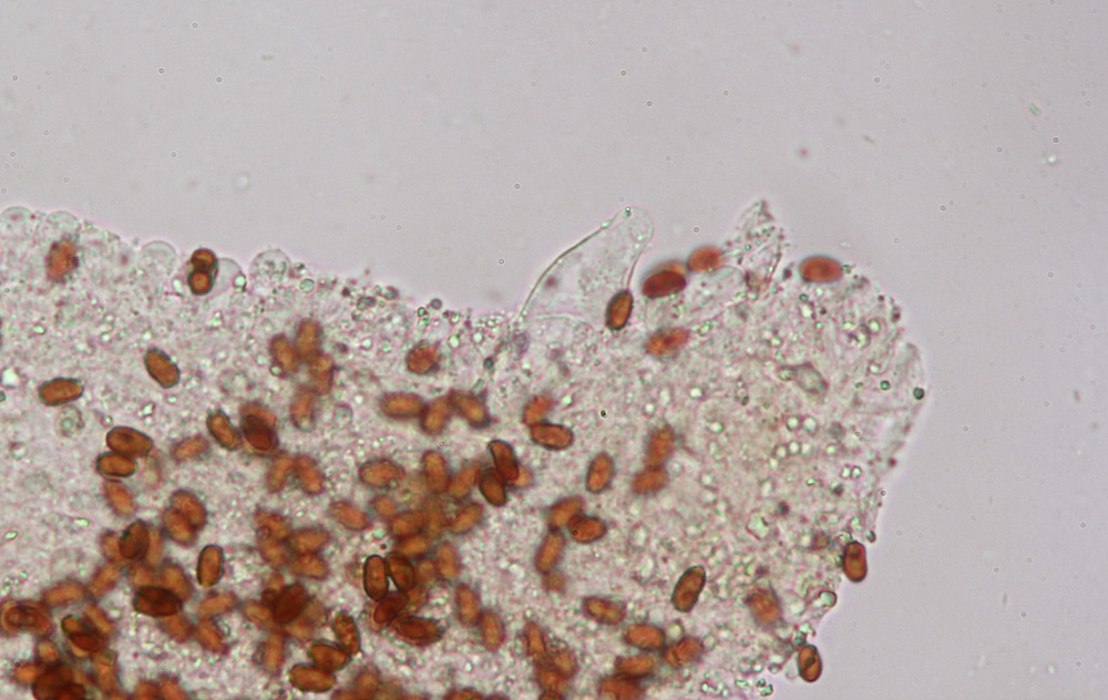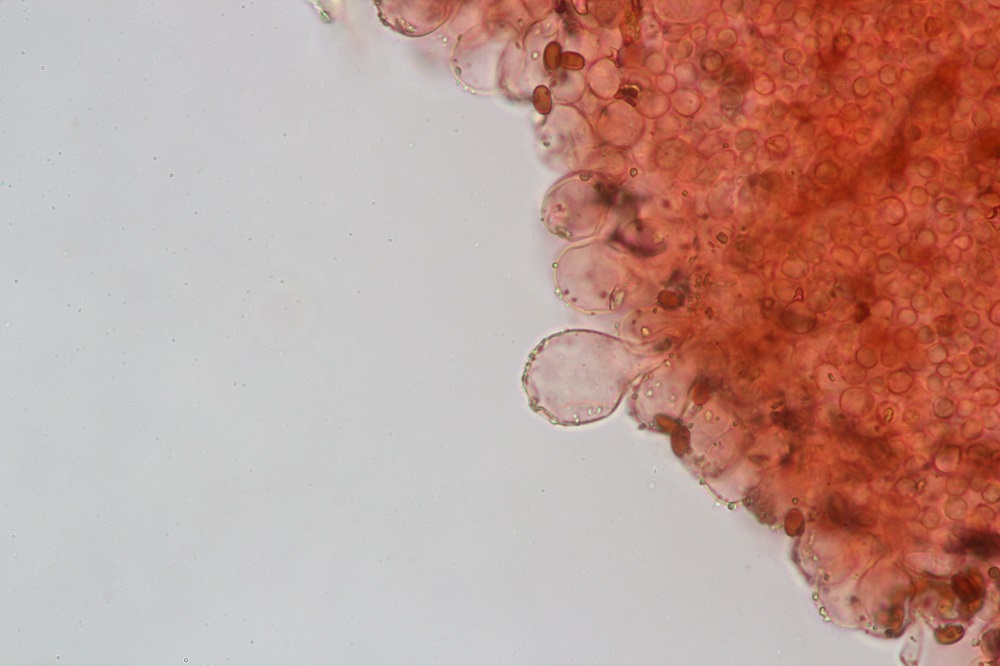 Hier mal ein Lamellenquerschnittsbild von Flammulaster granulatus (muss man sich natürlich vorstellen, daß sich die Lamelle nach unten noch weit fortsetzt, ist ja nur ein Ausschnitt):
