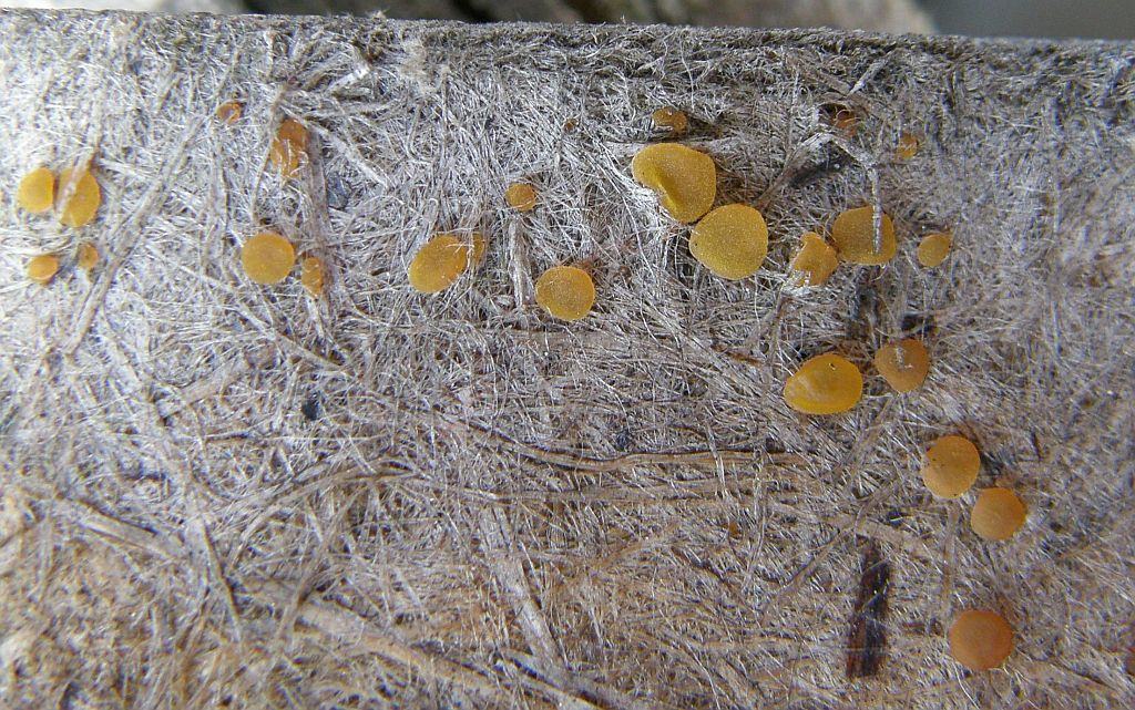 Die Pilze sehen aus wie Becherchen (Orbilia), sind aber keine. Das merkt man schon, wenn man die anfasst oder zu zerschneiden versucht. Die flutschen einfach unter der Rasierklinge weg, ohne festhalten lässt sich da nichts zerteilen.