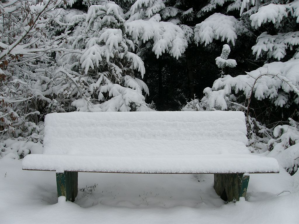 Ah, Eine Bank, aber hinsetzen tu ich mich jetzt nicht, da wird einem ja noch kälter, brrrrr.