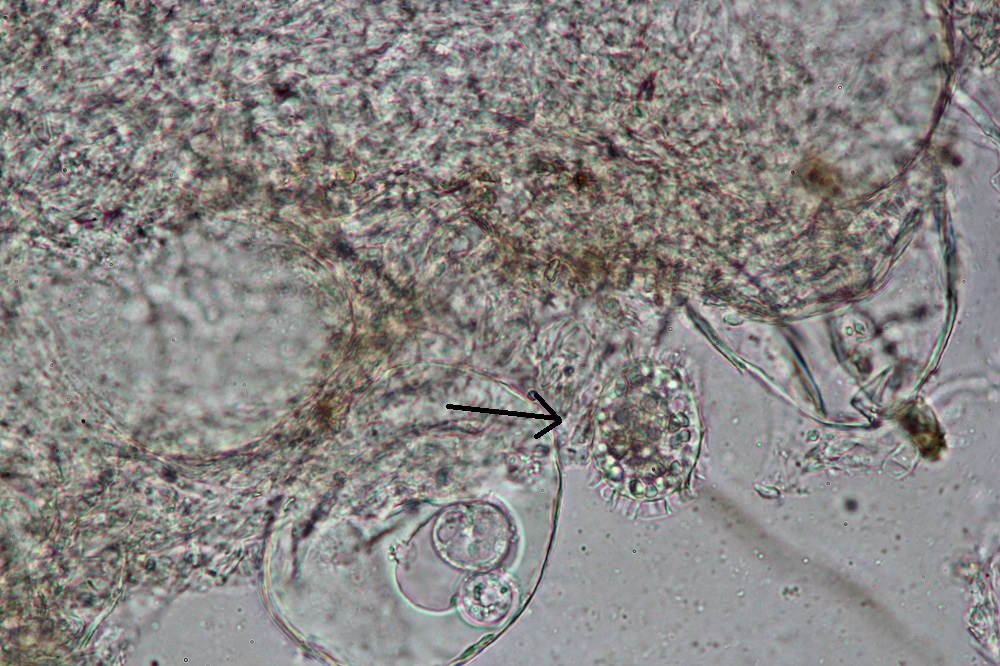 Wahrscheinlich ist der Fund einfach noch unreif und hat deswegen noch keine Sporen ausgebildet. Was eine Spore in der Entstehung sein könnte, ist das kugelige Ding im linken Ascus auf dem drittletzten Bild.