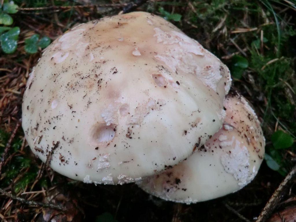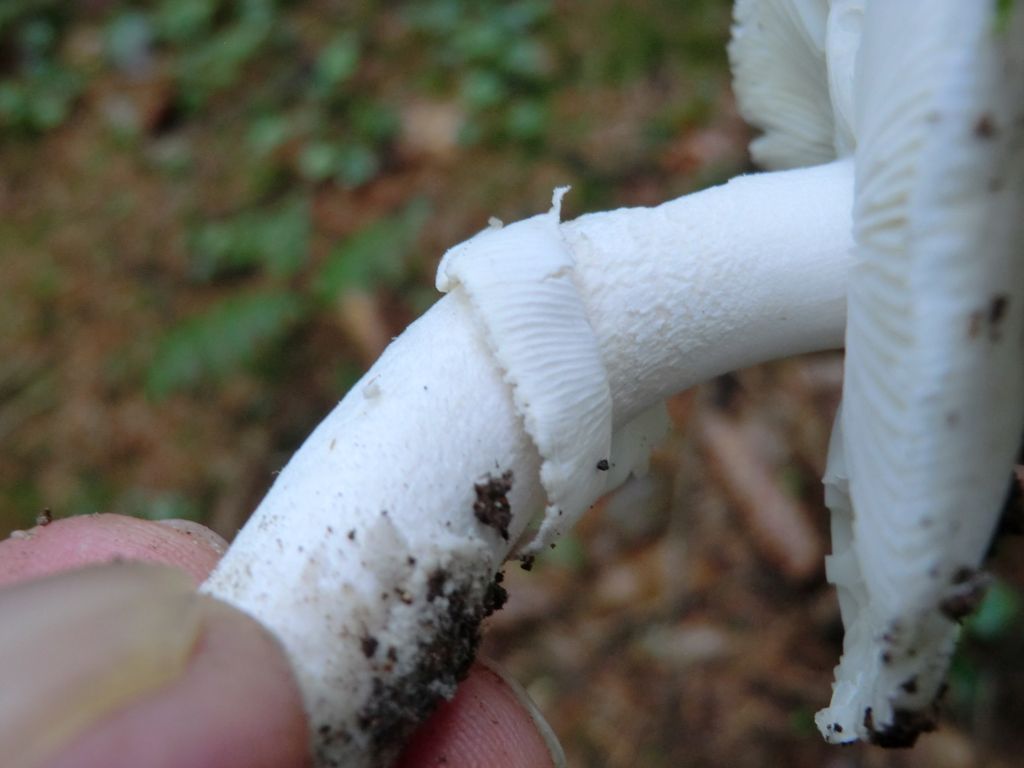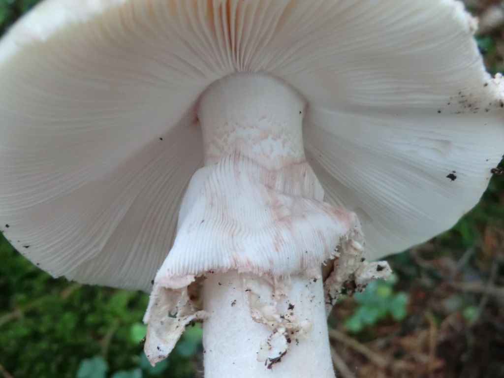 Pilz Nr.3 wie ich meine ein Perlpilz. Hut 9cm, Stiel 9cm lang, Geruch leicht pilzig, am Stiel sowie zwischen den Lamellen leicht rosa.