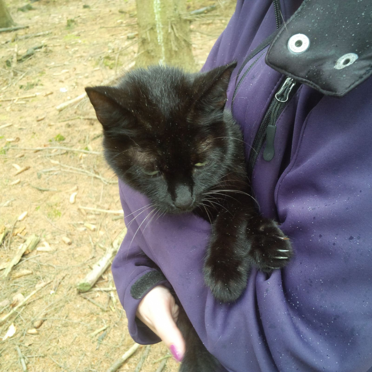 Wichtiger war an diesem Tag jedoch die folgende Geschichte. Bereits im ersten Wald sah ich beim Kriechen durch die tiefgewachsenen Tannen - eigentlich auf der Suche nach Steinpilzen, die ein Jahr zuvor am 15. Juli schon handgroß waren - plötzlich eine schwarze Katze. Wir waren mitten im Wald, abgesehen von einer Straße fernab von jeglicher Zivilisation. Die Katze lief einige Meter weiter und wir trafen sie erneut. Kein Halsband. Nachdem wir uns überlegt haben, was wir am besten machen sollen, nahm die Katzenfreundin unserer Truppe sie auf den Arm und merkte schnell, dass sie nur noch Haut und Knochen war. Auch war die Kleine voller Zecken. Immerhin war sie zutraulich und freute sich sichtlich über die Aufmerksamkeit. Also haben wir einige Zeit lang herumtelefoniert und wurden letztendlich von einem Tierarzt zurückgerufen, der sie aufgenommen hat mit dem Versprechen, sich um sie zu kümmern.