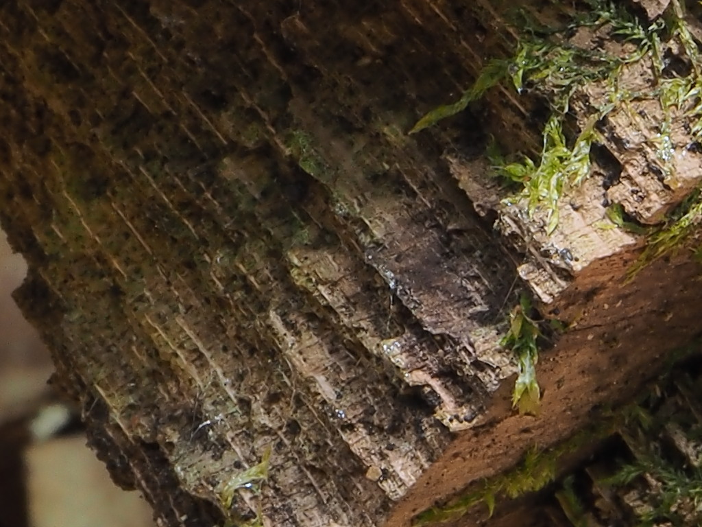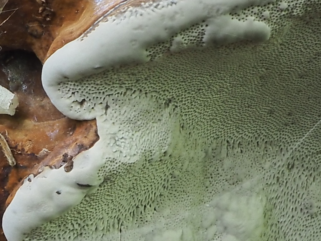 Dieses Bild ist von der "Anderen" Richtung, also von "Unten". Oder ist "Unten" dort wo die weissen Porenöffnungen sind? Ich kann mich entsinnen, dass der Stamm einmal sehr schräg stand.