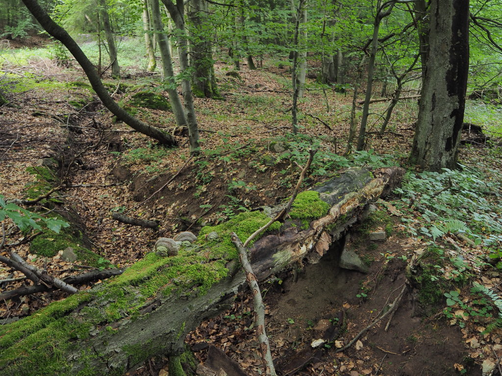 Vermutlich Buchentotholz, umgestürzt von rechts nach links über den Graben.