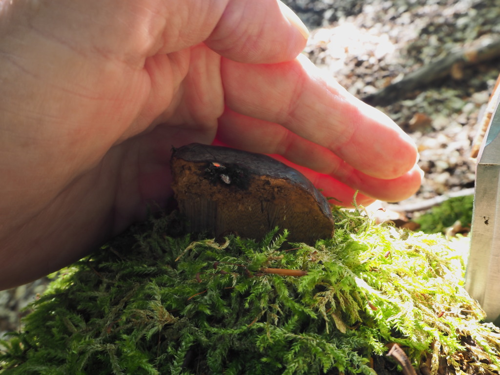 Weil es muss gar nicht sein, einen Waldbrand zu riskieren. beim Brutzeltest geht es darum zu überprüfen, ob die Hutkruste Harz enthält oder nicht. Dazu muss man nur oben auf dem Hut (gerne nahe der Anwuchsstelle) eine Flamme an die Kruste halten. Normalerweise reichen 10 bis 20 Sekunden. Dann sieht man Folgendes: