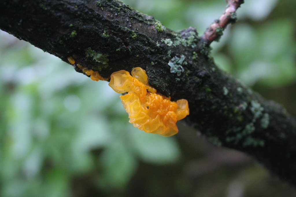 Auch golden fallen diese Pilze einem ins Auge. Die fand ich heute sehr häufig an abgefallenem Astwerk meist - Goldgelber Zitterling, Tremella mesenterica