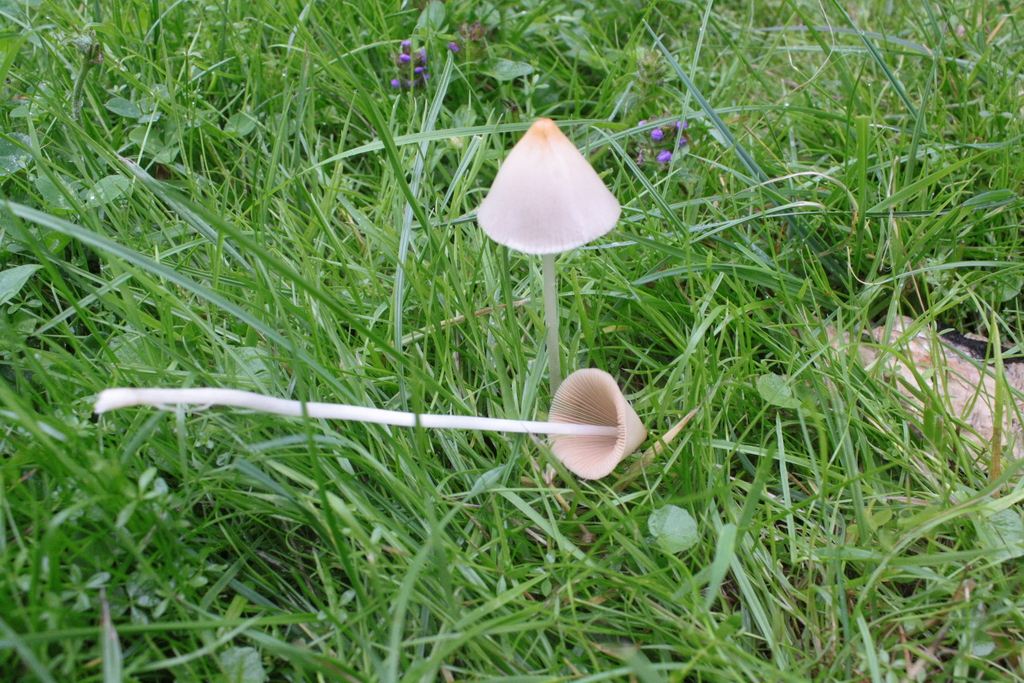 Bei diesem Pilz könnt ihr gerne helfen, wenn ihr mögt. Ich habe noch nirgends nachgesehen welcher es sein könnte und komme wahrscheinlich so schnell auch nicht dazu. Darum sind Tipps willkommen. Den sah ich häufiger über den Tag. Er wuchs in kleinen Grüppchen auf Rasenflächen und bekommt erst ausgewachsen diesen Nippel oben auf seiner Mütze. Die gelbliche Farbe ist aber schon vorher vorhanden.