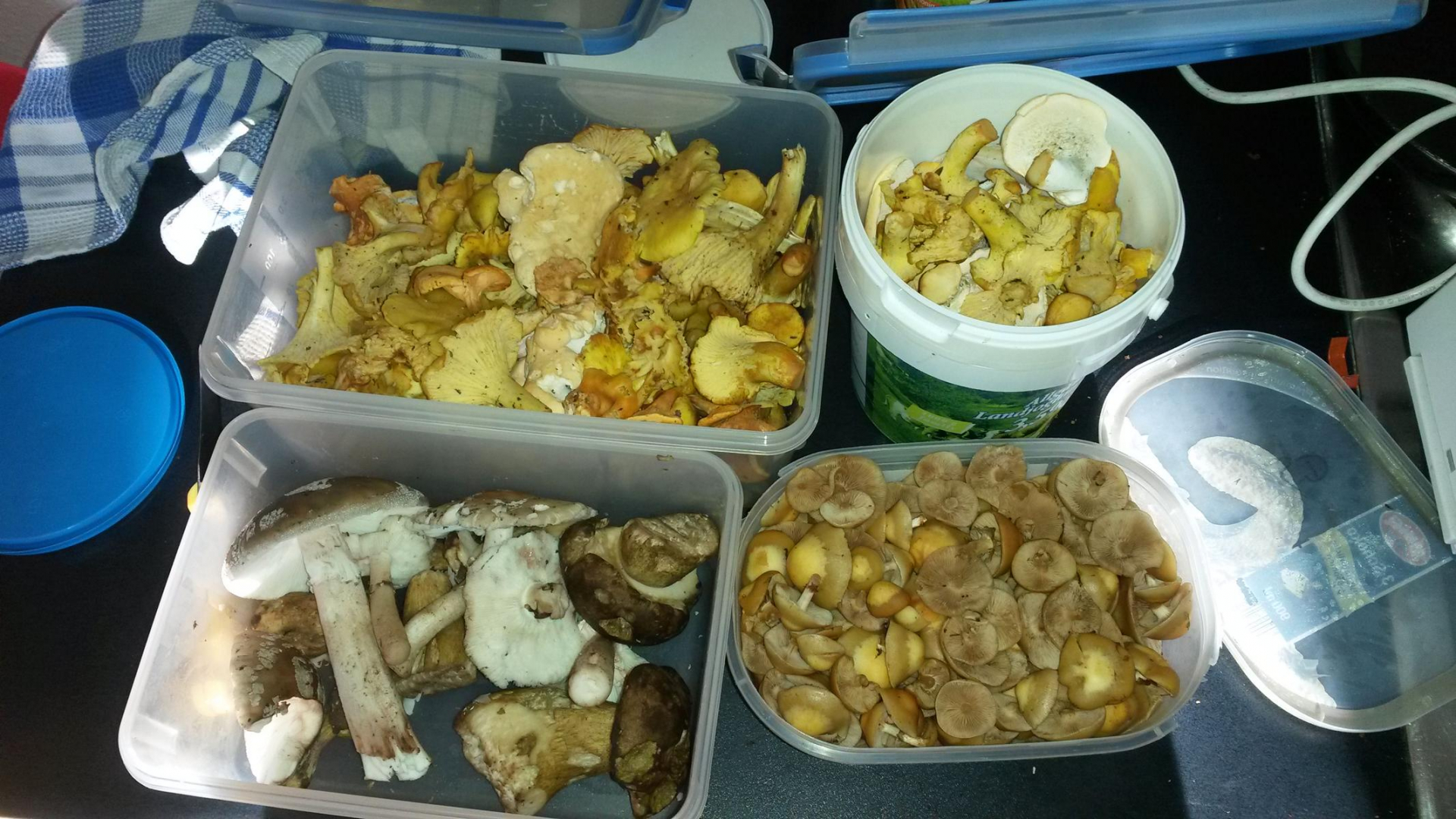heute haben wir nur die Pfifferlingsstellen aufgesucht und gut gefunden, sehr viel neue frische, aber auch versteckte Exemplare riesengroß, meistens in den Wiesenrändern.