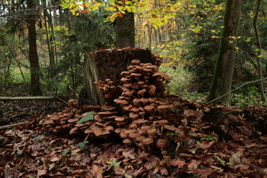 Gaaaaanz zufällig hab ich gestern diesen riesen Pilzbestand im Wald gefunden. War sehr leicht zu übersehen wegen dem ganzen Laub. Ich hab direkt an den Hallimasch gedacht, es war auch der einzige Pild der laut meinem Pilzbuch zur Beschreibung passt.