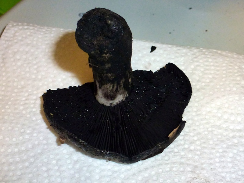 Bei genauerer Betrachtung waren die Lamellen jedoch weit weniger spröde. Außerdem verfärbten sich verletzte Stellen nach 20-30 Sekunden schwarz, ohne vorher zu röten. Der Geschmack war ganz schwach scharf, aber auch das erst nach längerem kauen. Heute, als ich den Pilz aus der Probendose nehmen wollte, war der kohlrabenschwarz und sonderte einen unangenehmen, süßlichen Geruch ab. Nach vorliegender Literatur kam ich dann auf den Mentholtäubling (Russula albonigra). Den Menthol-Effekt konnte ich nicht feststellen, hab aber im Feld auch nicht drauf geachtet. Heute wollte ich das nicht mehr probieren.