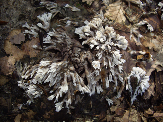 komm gerade aus dem Stovener Wald bei Salzbergen (Niedersachsen) und habe diesen schönen Pilz gefunden. Er wuchs in einem Eichen-Hainbuchenwald und kam an mehreren Stellen vor. Ich meine, es ist der Weiße Warzenpilz (Thelephora penicillata). Leider ist die Aufnahme nicht so gelungen. Dennoch hoffe ich, dass man den Pilz ansprechen kann. Lieg ich mit meiner Vermutung richtig? Oder gibt es kaum noch einen Pilz, den man ohne Mikroskop bestimmen kann?