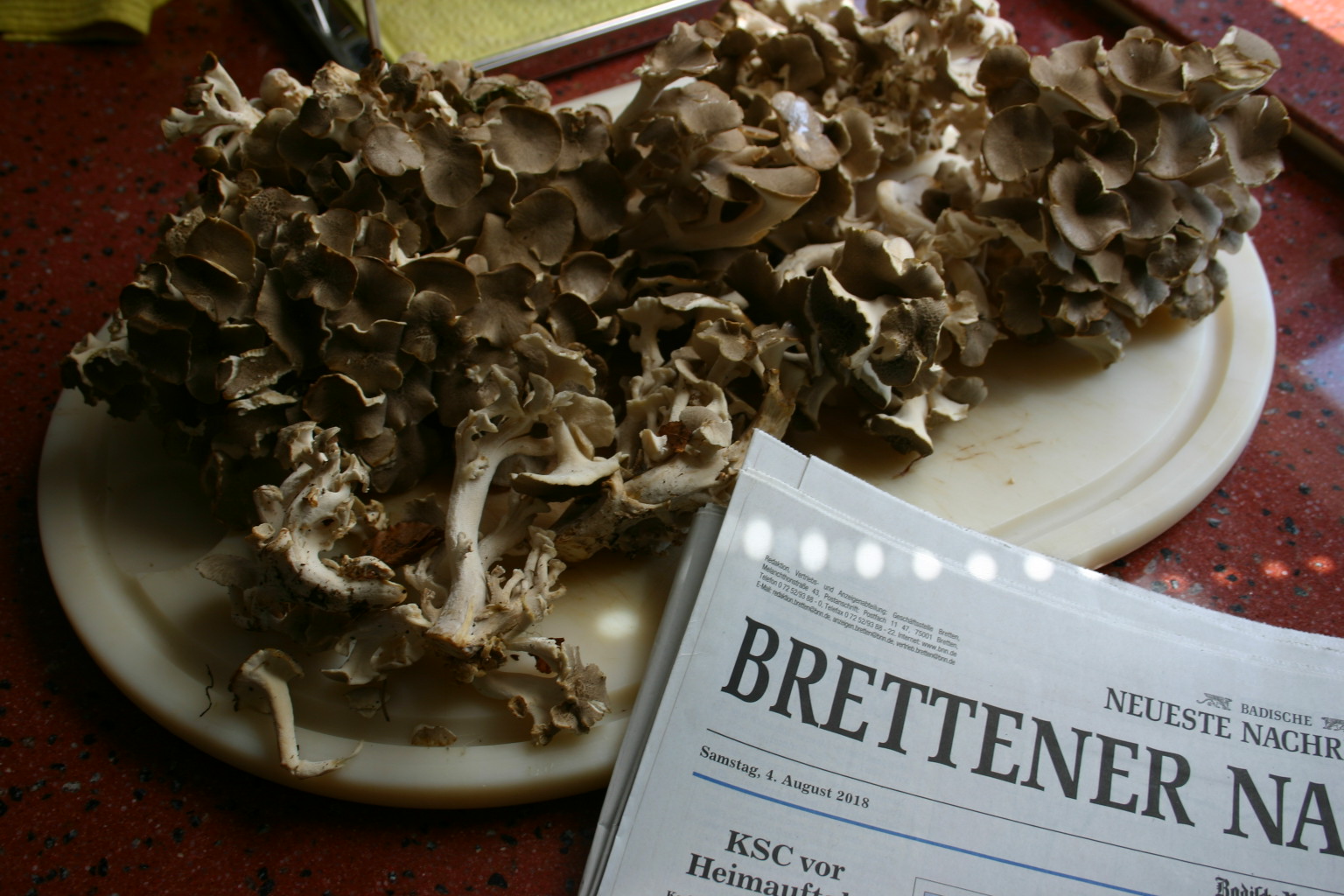 Aber der Reihe nach: gestern im Auto, auf der Heimfahrt nach einer längeren Wanderung jenseits meines Temperatur-Wohlfühlbereichs, meinte meine Frau noch: sollen wir noch kurz nachsehen? Im Interpretieren solch dem Außenstehenden unverständlichen Aussagen geübt und wohl wissend, was gemeint war, meinte ich: Nö. zu trocken, es gibt gerade keine Pilze! (Anmerkung 1: wenn wir in dieser Art über "Pilze" reden, sind ausschließlich zum Genuß geeignete gemeint) (Anmerkung 2: Juliniederschlag hier selbst gemessen 20 Liter) Sogar im Pilzforum schreibt kaum einer was über Funde, so fuhr ich fort, auch nicht dort, wo es mehr geregnet hat! Außerdem ist mir zu heiß zum weiter draußen rumrennen. Antwort meiner Gattin: Aber vor zwei Jahren haben wir in der ersten Augusthälfte welche gefunden, und es ist auch nicht weit! Ich meinte nur, sie könne ja suchen, letztes Jahr gabs auch keine, und da war es nicht so trocken. Ich sähe darin keinen Sinn. Und dabei ließen wir?? es bewenden.