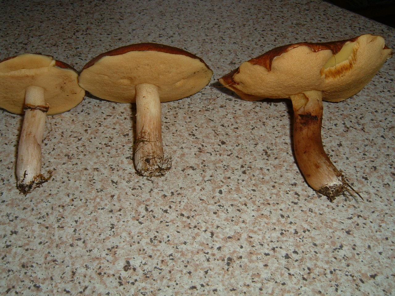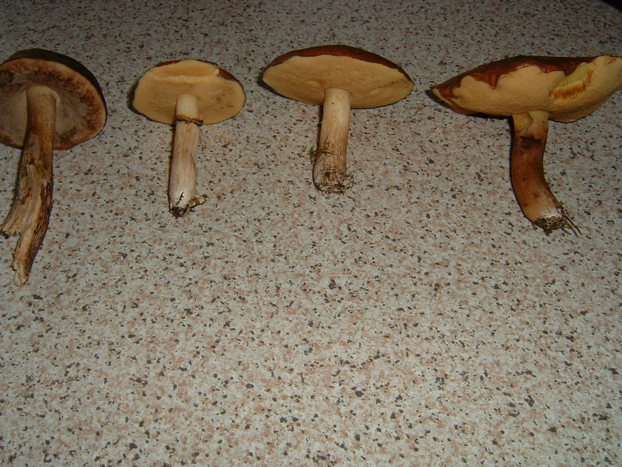 Diese Pilze fanden wir heute am Waldrand. Z. B. ein Pilz unter einer Birke (Birkenpilz?), die Anderen mit klebrigem Hut, Haut leicht abziehbar, nicht Bläuend und nicht bitter. (Maronen?)