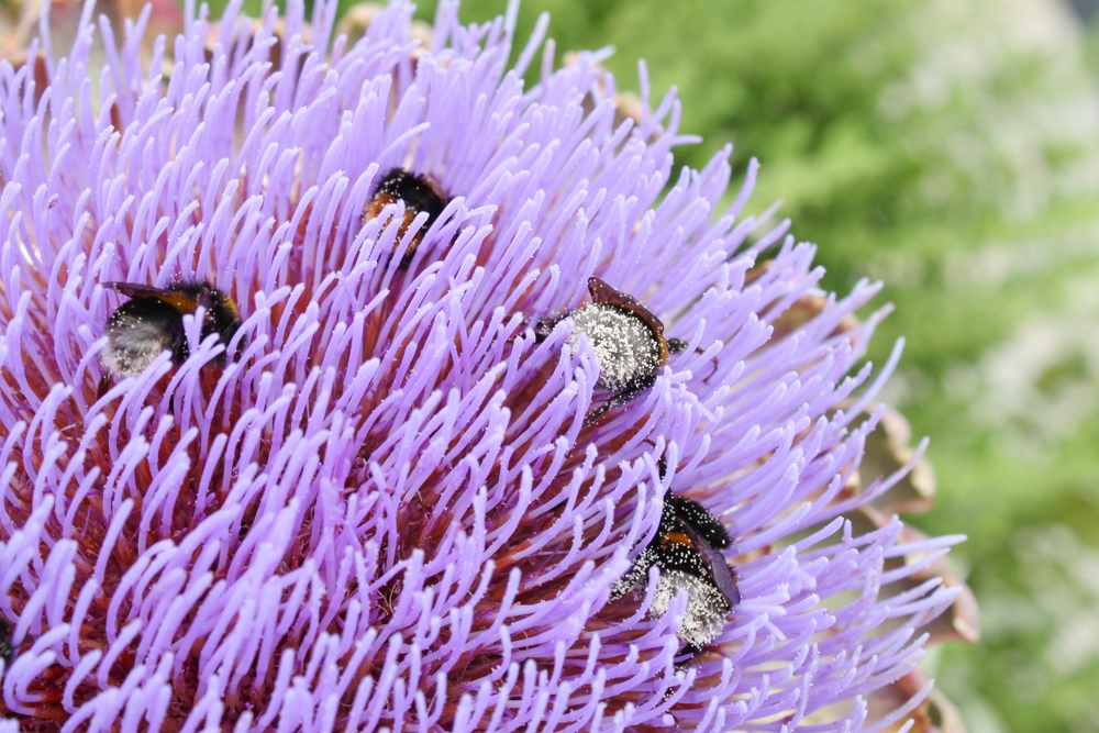 5. Die großen Blütenstände der Artischocken haben nicht nur mich in ihren Bann gezogen! Eine der Pflanzen, die ich im nächsten Jahr unbedingt versuchen will, in meinem Garten zu ziehen. Allein schon die völlig zugestaubten und tief abgetauchten Hummeln haben mir das klar gemacht. Was für ein herrlicher Anblick!