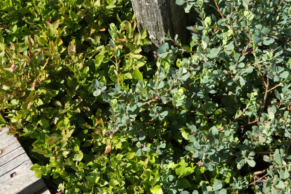 Heidelbeeren und Rauschbeeren. Besonders fällt das unterschiedliche Grün der Blätter auf. Das der Rauschbeere ist ein kühleres blaugrün.