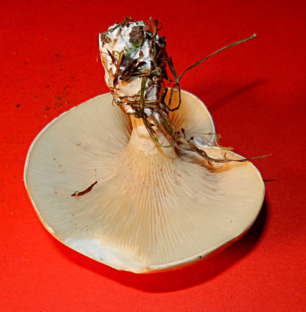 Lamellen: Weiß bis cremefarben, am Stiel herablaufend, gedrängt stehend und untermischt