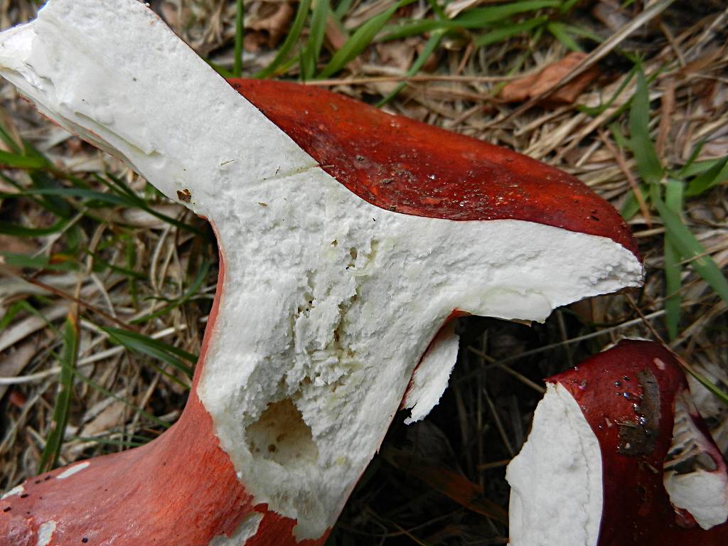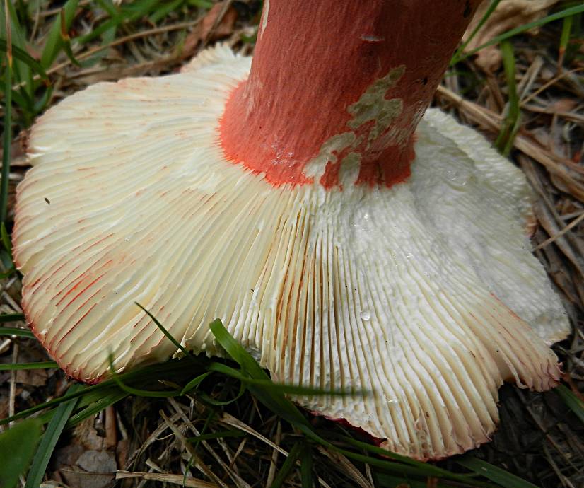 Lamellen: Weiß bis leicht gelblich, teilweise rote Schneiden, splitternd, am Stiel leicht herablaufend