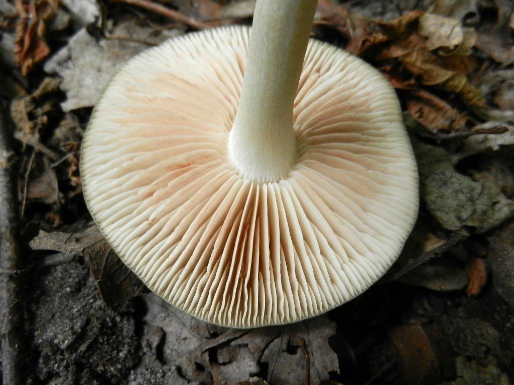 Hut: Weiß-gräulich, flach, leicht um Lamellen gebogen
