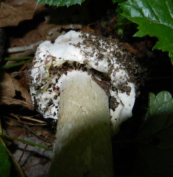 Stiel: weiß, in Richtung Basis gräulich-schmutzig genattert, Basis knollig, lappige Scheide, Manschette nicht zu erkennen bzw. stark verkümmert (vermutlich wegen Trockenheit)