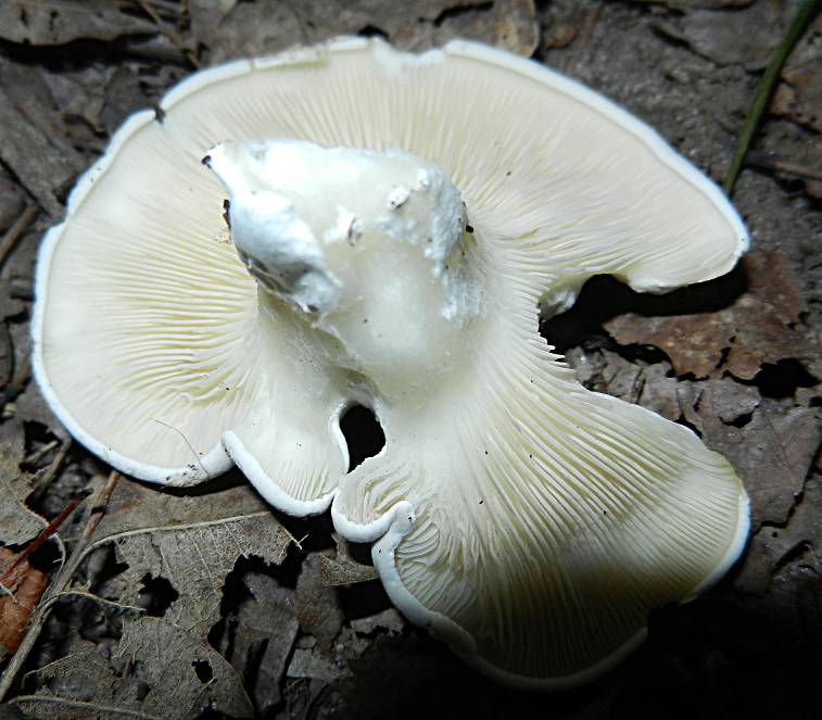 Hut: Weiß-gräulich, flach, leicht um Lamellen gebogen