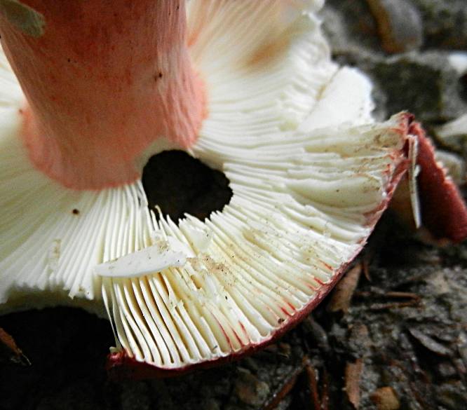 Lamellen: Weiß bis leicht gelblich, teilweise rote Schneiden, splitternd, am Stiel leicht herablaufend