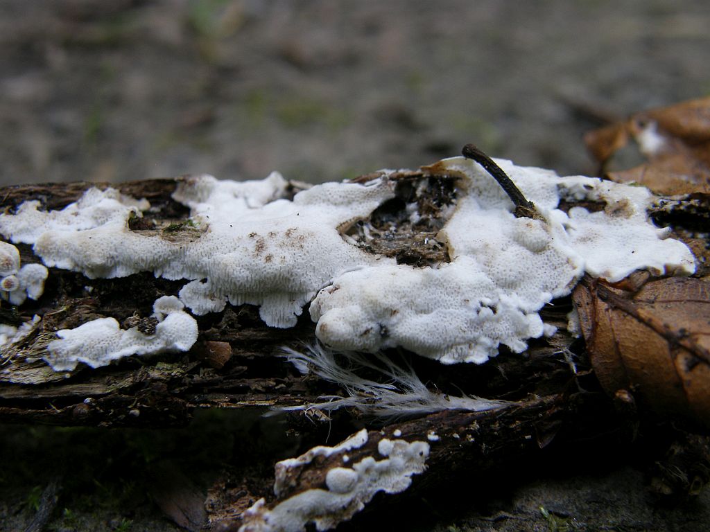 Dafür fand sich am selben Holzstück noch ein auffälliger, erst weißer, dann cremeockerfarbener, dann sogar liecht ins Fleischige umfärbender Rindenpilz mit dicken, auffälligen Rhizomorphen (auf dem Bild mit blauem Rucksack links unten auf und unter der Rinde):