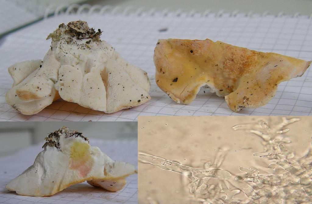 Den werde ich die Tage noch als anfrage einstellen. Es kann freilich auch Physisporinus sanguinolentus sein, aber mit untypischer Farbreaktion. Dieser hier rötet halt nicht, sondern er graut. Und als er am nöchsten tag nach fleischfarben umgefärbt war, da bräunte er. Auch scheinen die Sporen einen Tik zu klein zu sein und vielleicht etwas zu rundlich.