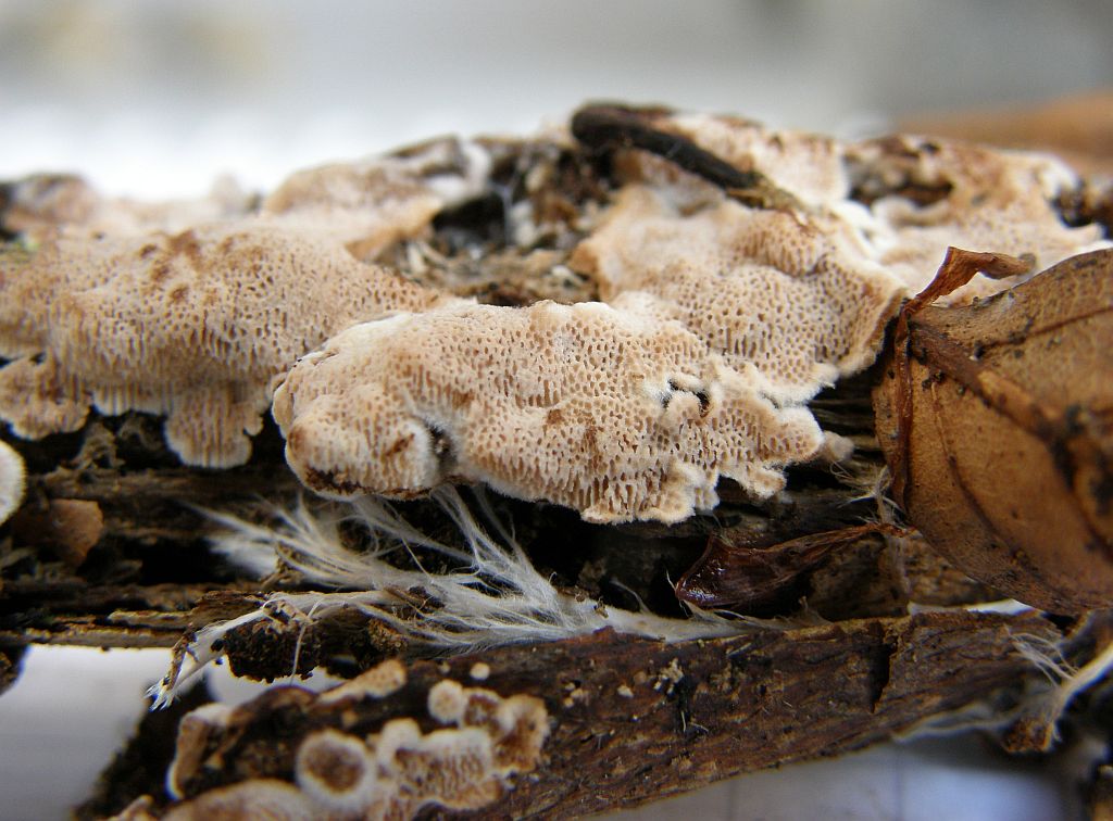 Der heißt bei mir momentan Phanerochaete cf velutina (Flaumiger Zystidenrindenpilz). So ganz zufrieden bin ich damit aber nicht, da sind ein paar Punkte, die nicht so ganz passen wollen (Dicke der Rhizomorphen, Sporengröße, Hyphen im Subikulum).