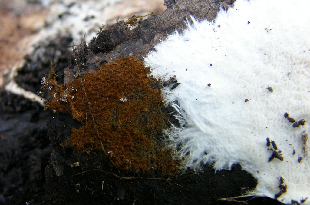 Dafür fand sich am selben Holzstück noch ein auffälliger, erst weißer, dann cremeockerfarbener, dann sogar liecht ins Fleischige umfärbender Rindenpilz mit dicken, auffälligen Rhizomorphen (auf dem Bild mit blauem Rucksack links unten auf und unter der Rinde):